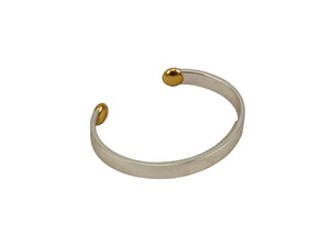 The stylish and slick cuff consists of 925 sterling silver that has two bronze ends, and is designed to be non-gender specific. Coming in 3 sizes, it is easily slipped on and off the wrist. It can be worn with the bronze ends and opening outwards facing or with the silver band facing. Either way, the inside of the band - the textured section is always accessible and always discreet.  No-one would know it is there or is being utilised.