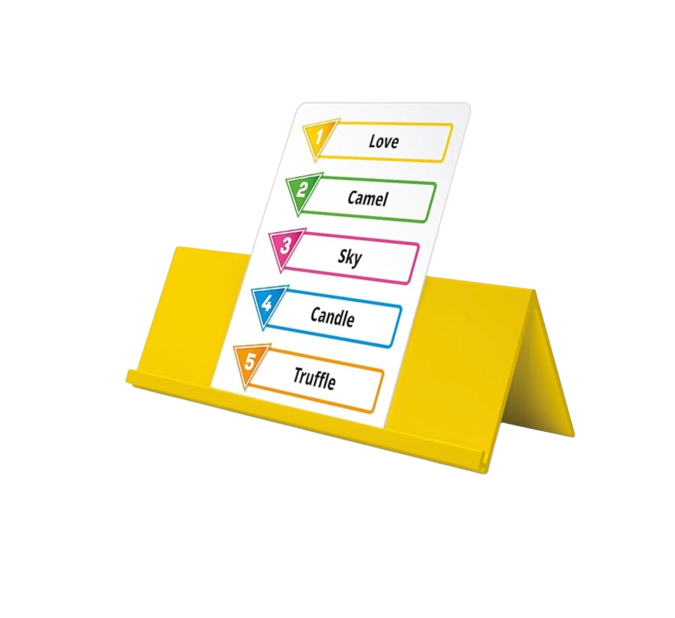 One player, the active player, chooses a number between 1 and 5 that aligns with one of the words on their card (the active player cannot see their word). The other players must write a single word on their easel as a clue to help the active player figure out what their word is.