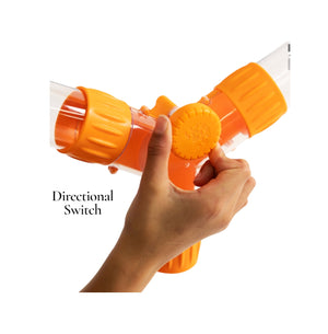 The Air Toobz encourage spatial reasoning, creativity, experimentation, problem-solving, and STEM learning. The fan unit features a simple on/off button, a large dial with LED indicators for adjusting airflow, and has a rubber carrying handle.