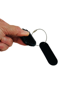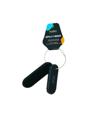 The Kaiko SpiKeyRing is a specifically designed and unique multi-purpose fidget. There are two discreetly sized sleek black detachable tabs. One gives soft and flexible tactile input, whilst the other has firm and sharp, for those who need intense targeted input. All on a handy fidget loop.
