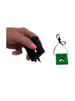 The Chewy Charms Necklace Chew - Creeper is for the minecraft fans that need a thicker, chunkier chew. Worn as a necklace, on a safe breakaway cord and rated for heavy use.