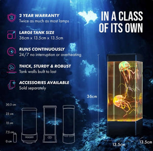 The Jinx Luminous Mood Lamp - Jellyfish provides calming visual support. Designed in Australia, with a pump that safely allows the lamp to operate continually. Plugs into a standard power outlet, is large, solid and stable. Comes with an unparalleled 2 year warranty. Captivating and calming visual input combined with quality, safety and sturdiness.