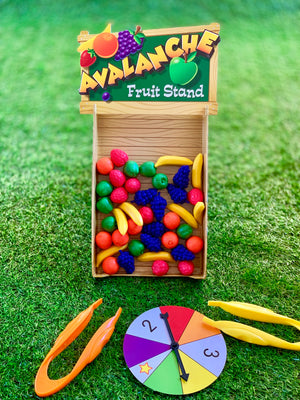 The Avalanche Fruit Stand Game is a fun way for your child to improve their fine motor skills, especially the all-important pincer grasp that prepares children for handwriting.
