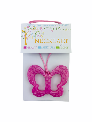 The Chewy Charms Necklace Chew - Pink/Butterfly is a popular butterfly shaped silicone chew that is worn as a necklace, on a safe breakaway cord. Rated for light use.