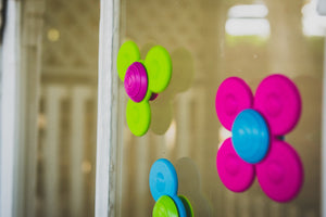 Stick them to any smooth, flat surface like a bathtub wall, a tabletop, or a window. Once they are securely attached, give them a spin and watch them whirl away!