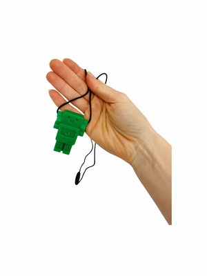 The Jellystone Robot Man Chew is a silicone, wearable chew mounted on a safety breakaway necklace cord. It has several textures which double as tactile input and a fidget.