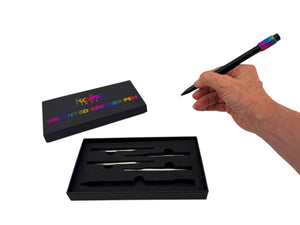 The Kaiko Weighted Spinner Pen is a black ball point pen with super powers. It features a discreet spinner on the end PLUS it is weighted. The weight and slight vibration helps provide input to the muscles and joints of the hand, assisting with handwriting and also hand strength. A fabulous sensory support with 4 extra pen refills included.