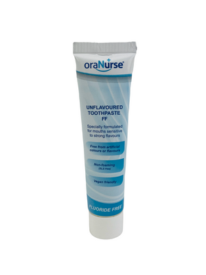 OraNurse® Unflavoured Toothpaste FF - Fluoride FREE is specially formulated for mouths sensitive to strong flavours and scents. This toothpaste is free from artificial colours or flavours, Fluoride, non foaming and is vegan friendly. You will find the correct the daily recommended fluoride protection - all taste free! Comes in a 50ml tube.